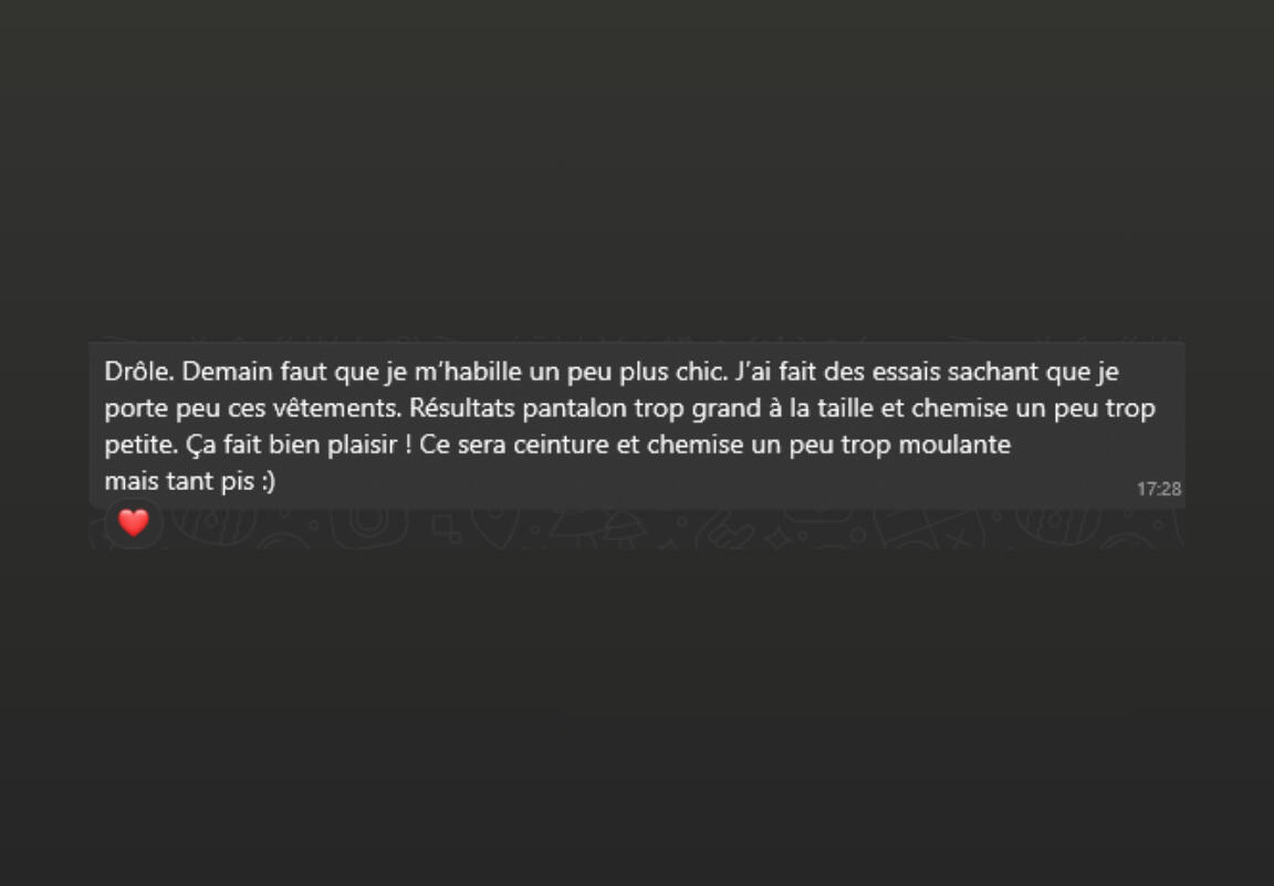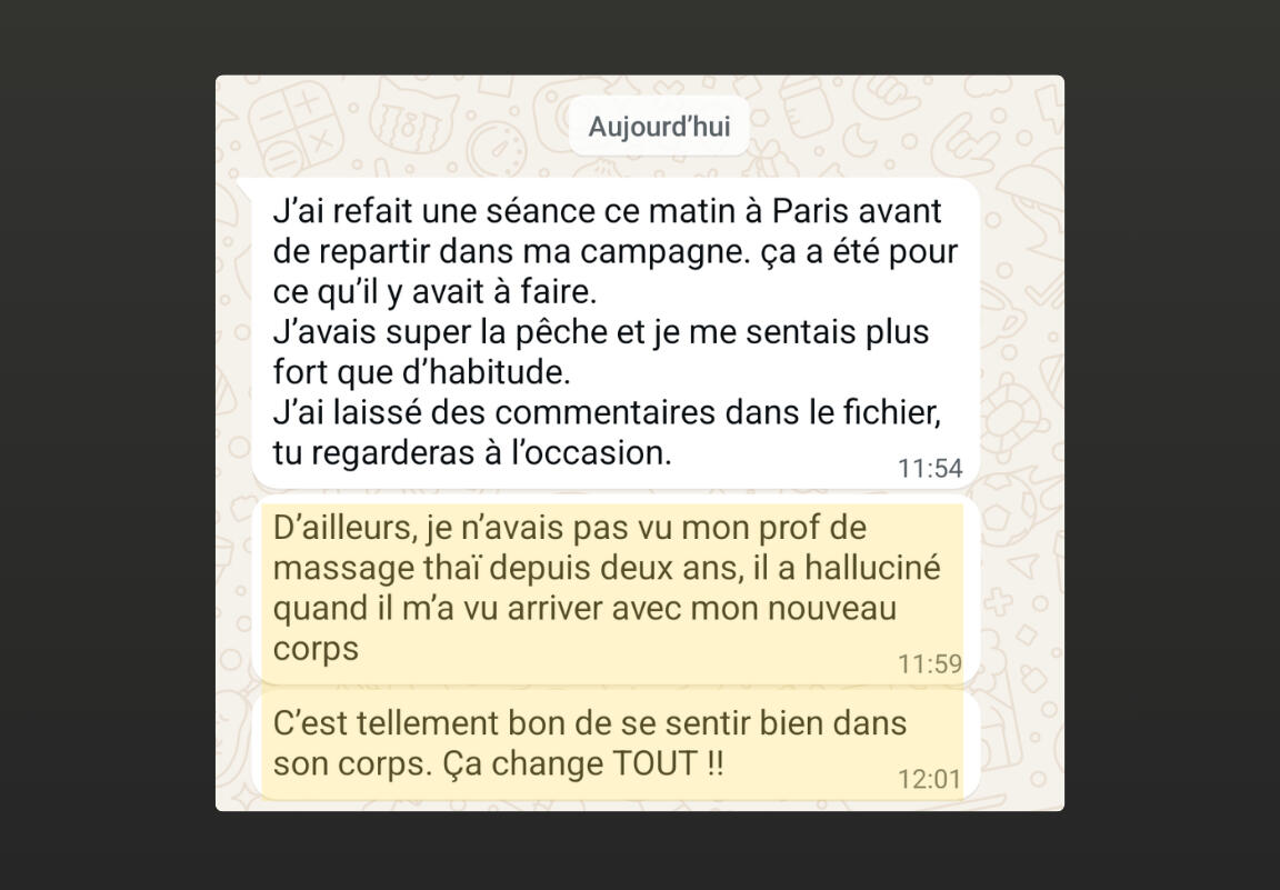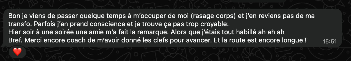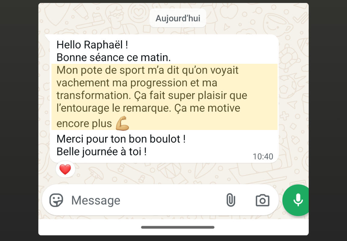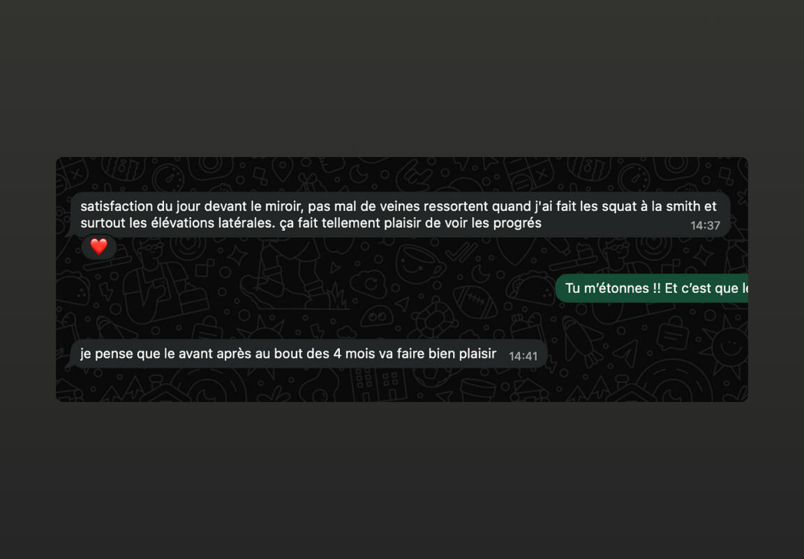 • Un accompagnement privé où tu vois tes progrès en temps réel (photos avant/après, victoires quotidiennes) et où tu peux poser n'importe quelle question sans te sentir jugé