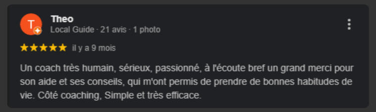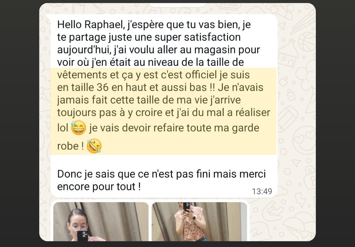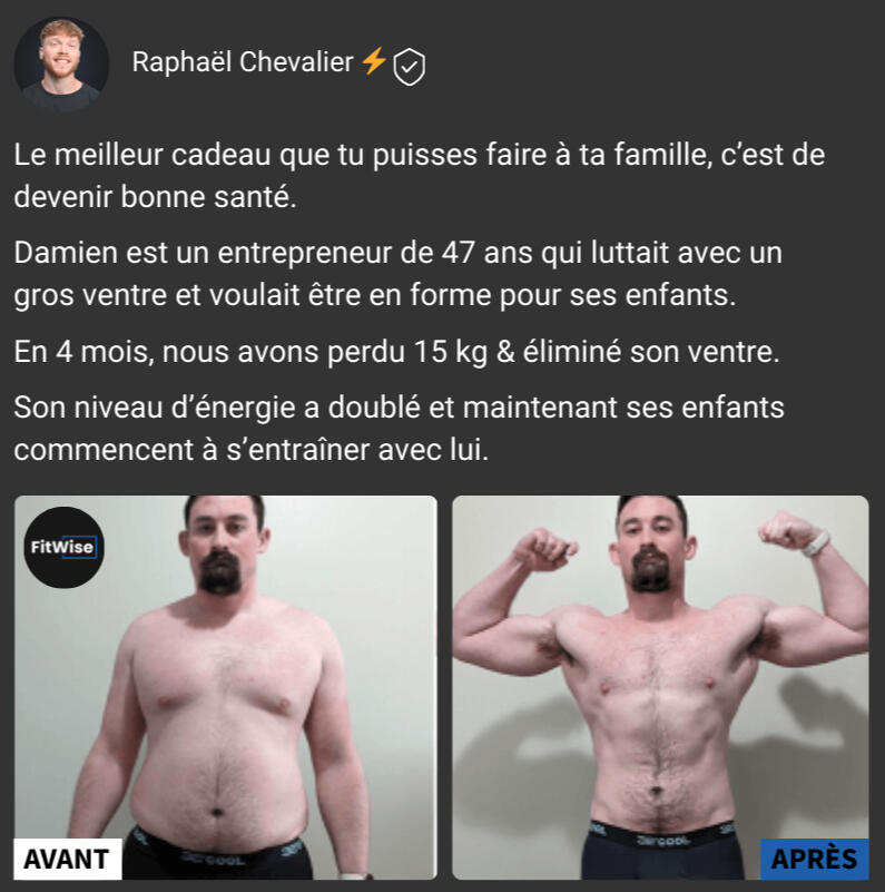 "En seulement 4 mois, j'ai perdu 7 kg et 11 cm de tour de taille, j'ai enfin le corps athlétique dont j'ai toujours rêvé.C'est une méthode qui fonctionne vraiment ! Je me suis investi à 100 % dans son programme, et cela a transformé mon corps tout en me faisant gagner énormément de temps.Grâce à Raphaël, j'ai adopté un nouveau mode de vie. Je ne me suis jamais senti aussi bien dans mon corps et dans ma tête."