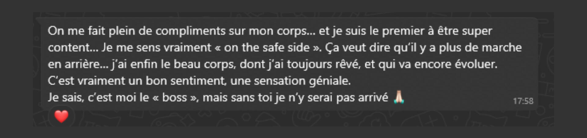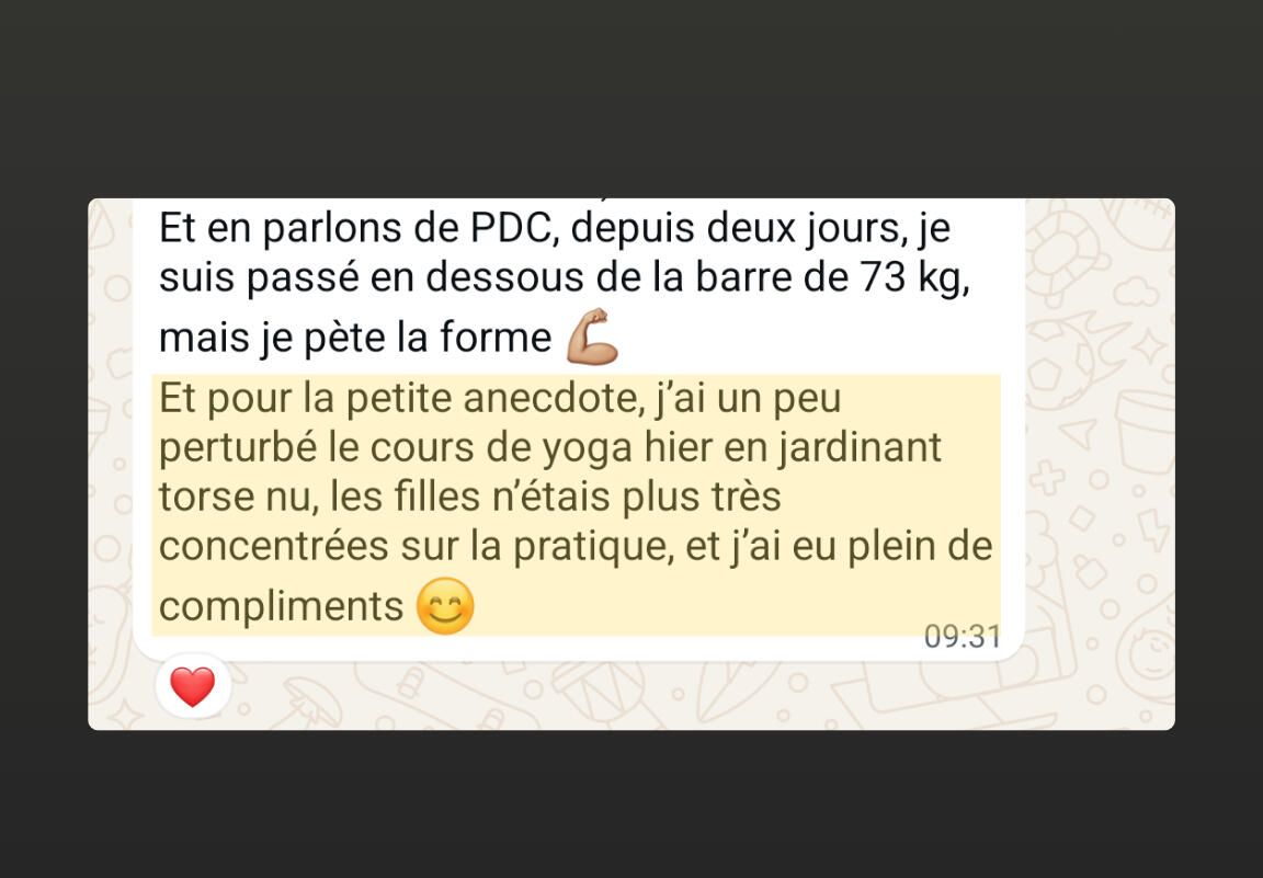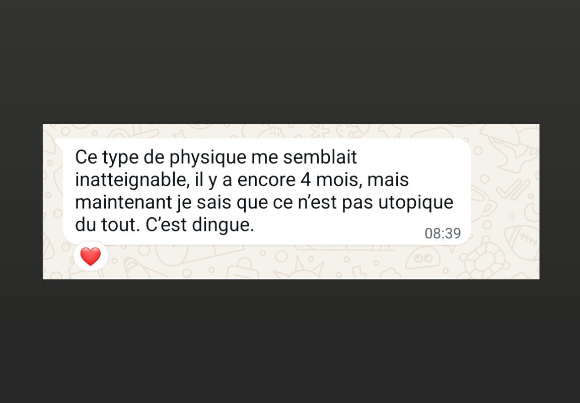 • Un accompagnement privé où tu vois tes progrès en temps réel (photos avant/après, victoires quotidiennes) et où tu peux poser n'importe quelle question sans te sentir jugé