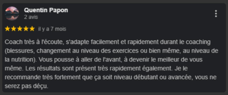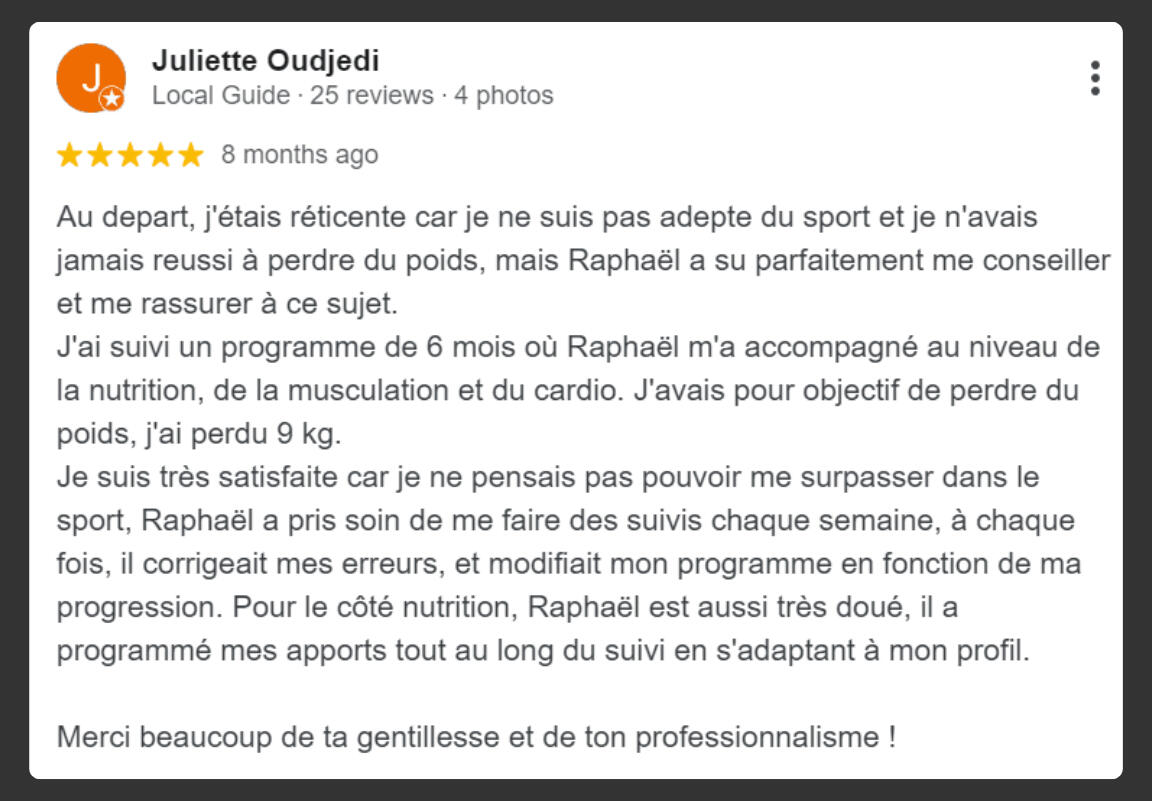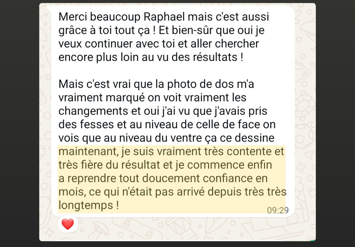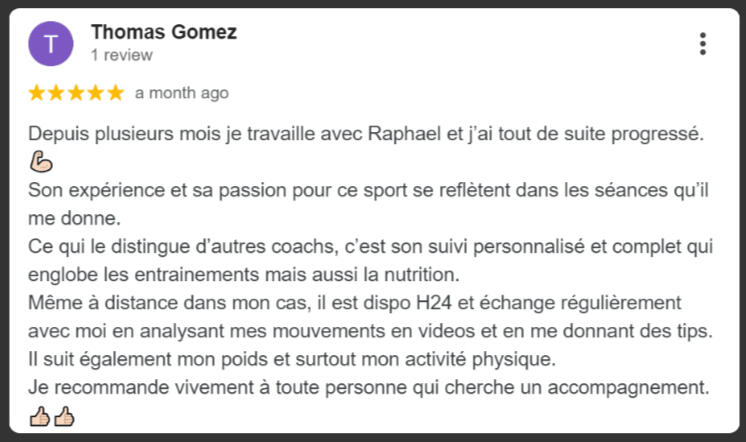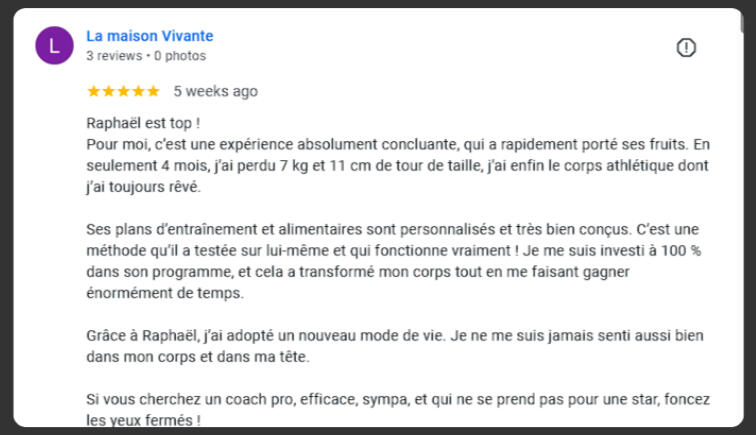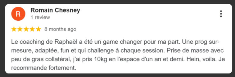 "En seulement 4 mois, j'ai perdu 7 kg et 11 cm de tour de taille, j'ai enfin le corps athlétique dont j'ai toujours rêvé.C'est une méthode qui fonctionne vraiment ! Je me suis investi à 100 % dans son programme, et cela a transformé mon corps tout en me faisant gagner énormément de temps.Grâce à Raphaël, j'ai adopté un nouveau mode de vie. Je ne me suis jamais senti aussi bien dans mon corps et dans ma tête."